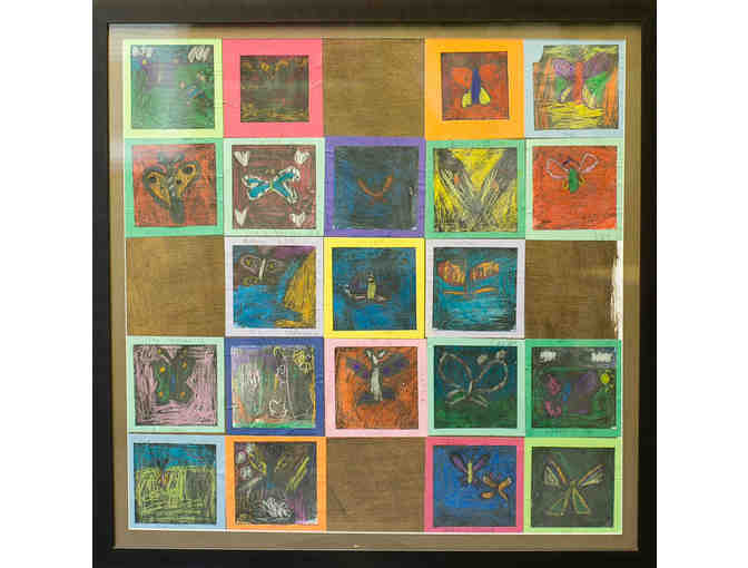 32”x32” framed and matted drawings of imaginary butterflies. Each student created their own butterfly for this collaborative piece.