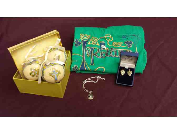 A basket of Celtic Love, bid on this collection of a set of Celtic decorative bulbs, Celtic Lands enamel earrings, “Tree of Life” sterling silver pendant, and an Emerald Isle T-shirt.