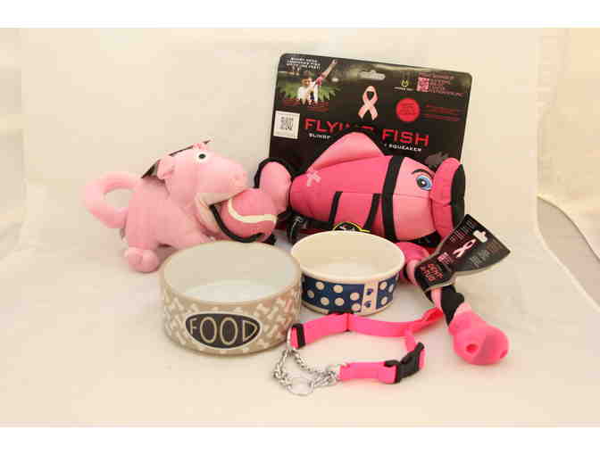 It’s a bird; it’s a plane, no, it’s a fun day of exercise at the park. The basket contains a fuchsia colored flying fish toy that can be launched up to 100 feet in the sky or over water , a bright pink tug and pull toy dog with tennis ball and squeaker, a large rope and plastic dent-a-tug, and a hot pink collar. When your dog has worked up an appetite and thirst at play, use the two cute ceramic water and food dishes to reward her for another healthy day in your life and hers.