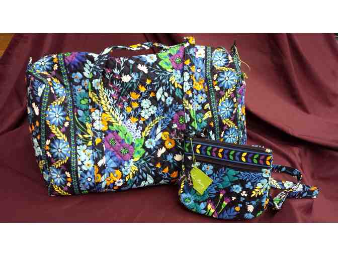 Going anywhere soon? Enjoy this large “Midnight Blues” Vera Bradley duffel, perfect for overnight trips and weekend getaways. The bag is complimented by a Vera Bradley matching “Little Flat Hipster” pouch to make you travel in style!