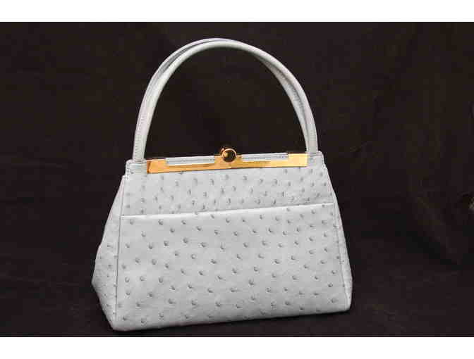 High-end luxury gray and blue ostrich leather handbag, designed by Helene, exotic skin accessories manufacturer. Helene designs private label goods for high- end boutiques. Made in Italy. Exquisite details, including an outer pocket and attractive gold detailing. The beige interior reveals a zippered compartment and a useful open pocket. The short handle will give a stylish look to any woman's ensemble.