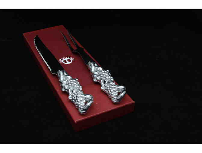 Sand-cast aluminum is what Arthur is known for today. Arthur Court is a leading national brand name in alternative metals. Inspired by nature, this lovely, useful carving knife and fork's handles are embellished with a grape motif. The stainless knife blade and fork tines will hold up for years of carving.