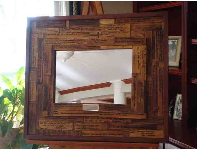 Inspirational quotes written by our 6th and 7th grade students surround this black walnut mirror crafted from a fallen tree from Kinder Park. Measuring 31.5” x 36”, this delightful piece is sure to bring thoughtful reflections to those who choose peer in.