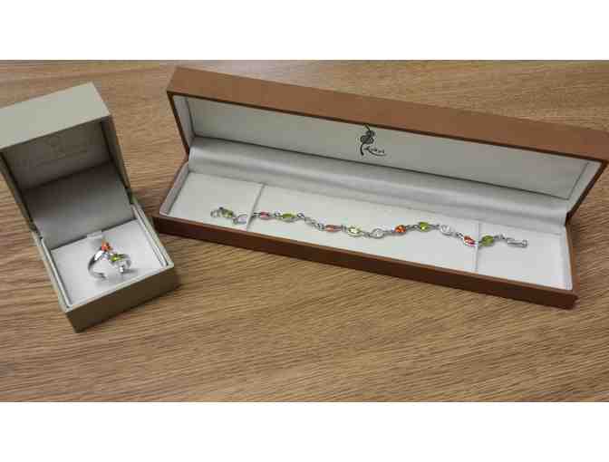 From Ardi fine jewelers in County Sligo, Ireland, comes this beautiful crystal and silver bracelet as part of the “Colors of Ireland” collection. The bracelet is matched with a sterling silver ring with similar colored crystals. This beautiful pair is a treasure to last a lifetime.