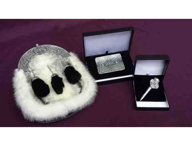 Wear this handmade kilt sporran with pride, made of Great Black Cross Kohinoor Mink fur with a beautiful Northumberland Cross design. Also includes matching Northumberland Cross buckle and kilt pin.
