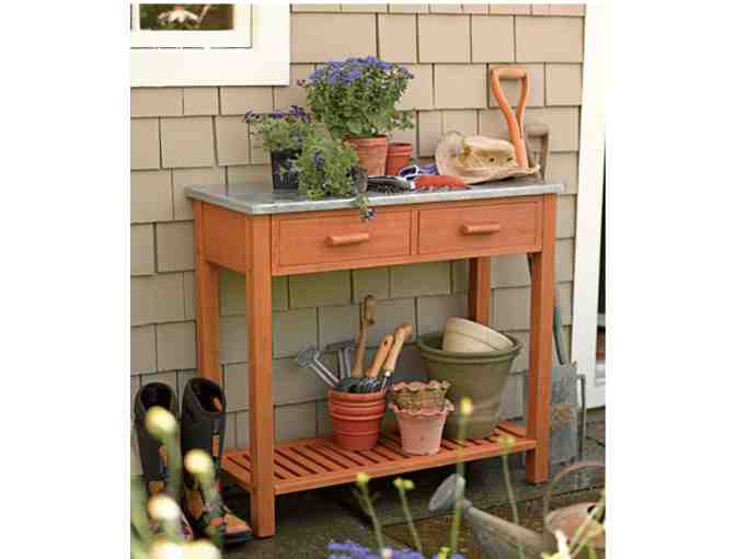 Originally designed for potting plants, this "garden chic" potting bench is made from durable Eucalyptus cladocalyx wood with an easy-to-clean zinc top. Use it in your entryway to hold keys and mail, as a serving table for garden parties, or anywhere else you need a little extra table space.