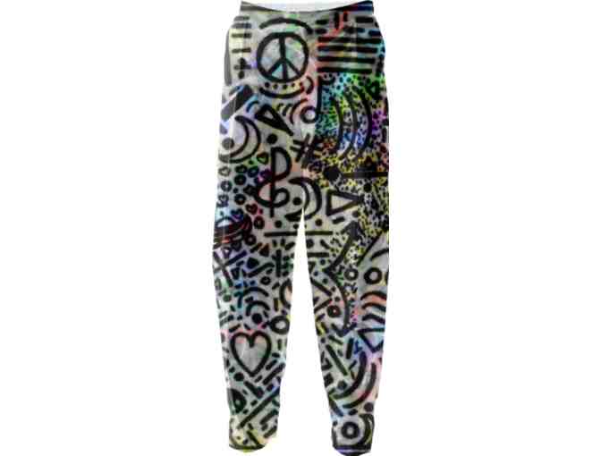ORIGINAL ART WORK will cover the entire pant front  / The backside will mirror the front / Covered elastic waistband in the back / Pant has deep pleats that create an architectural shape / The front has side seam slit pockets and the back features welt pockets / Body is 100% Cotton /