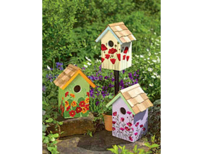 This trio of birdhouses will brighten up your garden and welcome nesting birds. Adorned with floral prints in summery colors, they make a beautiful additon to backyard decor. The 1-1/4" entrance holes attract common backyard birds like chickadees, nuthatches and finches. Loads of smart features keep birds healthy and happy. The cedar roof and drainage holes keep birds dry; ventilation keeps them cool. An interior screen beneath the entry hole helps fledging birds climb out. A clean-out door lets you tidy up the house at the end of the season. And a keyhole bracket on the back lets you mount it on a post or wall. Set includes one each of Cosmos, Nasturtium and Poppy designs.