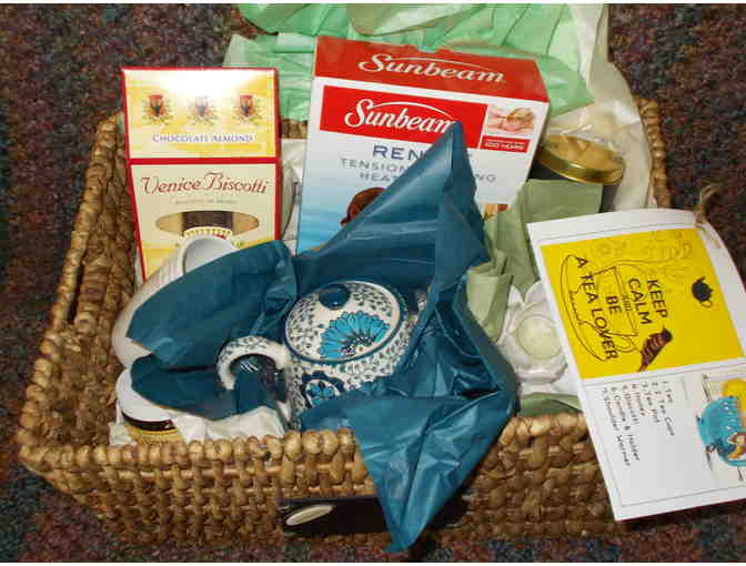 Includes: biscotti, a candle and holder, tea, two tea cups, a tea pot, shoulder warmer, and honey.