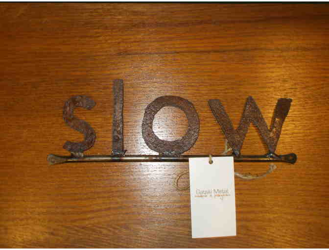 This handmade "SLOW" sign was made by a local artist from reclaimed metal.