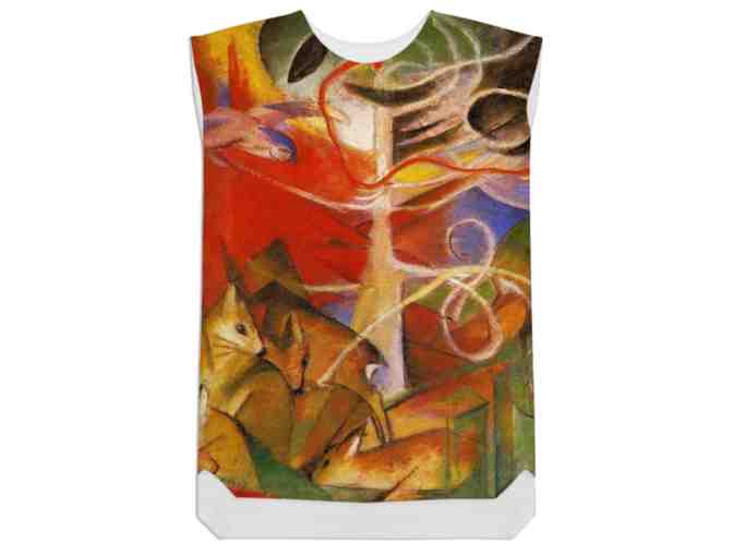 ART WORK will cover the entire front and back / The backside will mirror the front / Side seam pockets and an uneven hem / Body is 100% tencel