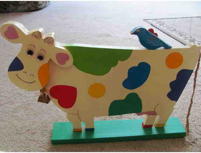 Brighten your child's room with this hand-carved and painted cow, complete with bell. Measures 14" x 19" x 3". Very good condition.