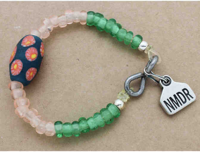 The bracelet includes glass beads from Indonesia with a large Javanese focal bead, and measures approximately 7" (stretchy).