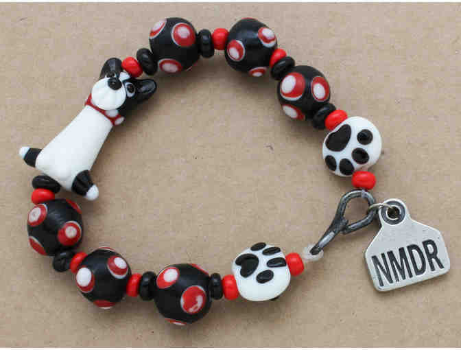 This "Freedom Bracelet" includes one or more actual links from a chain which was worn by a puppy mill dog saved by National Mill Dog Rescue. The tag is a replica of the one worn by Lily when she was rescued; it reads NMDR on one side and has Lily's number #251 on the other.