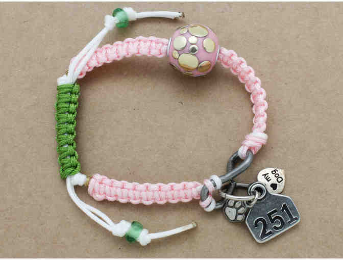 This "Freedom Bracelet" includes one or more actual links from a chain which was worn by a puppy mill dog saved by National Mill Dog Rescue. The tag is a replica of the one worn by Lily when she was rescued; it reads NMDR on one side and has Lily's number #251 on the other.