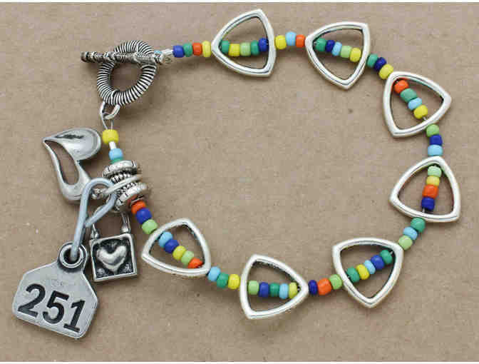 Jewelry designer, Sarah Blessing, generously contributed her time and talent to create the bracelet. Most of the beads and components were donated by Happy Mango Beads.
