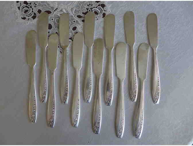 Set of 12 silver plated spreaders from the Wm Rogers company.  Measures approximately 6" in length.  Good condition.