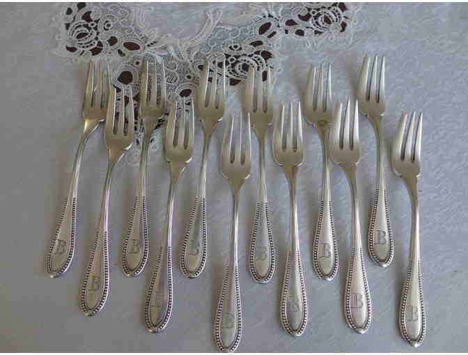 Set of 12 silver plated cocktail forks in a bead pattern, engraved with the initial "B". Good condition.