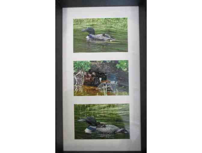 Presented here as a series of 3 photos, the photographer captures the chick's first rides on its Dads back as well as an intimate look at the chick being fed by Dad. The female loon, not pictured, was sitting on its nest as another chick was ready to hatch. While taking photos of this sweet domestic scene, the photographer was well aware that an eagle was circling overhead. The photos were taken at Pawtuckaway Lake in Raymond/Nottingham, NH. The 4x6 inch photos are framed in handsome black shadow frame that measures 8 1/2 x 15 1/4 inches.