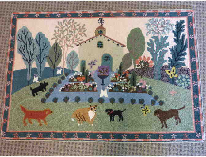 This beautiful Hand Hooked rug, made from %100 wool, has a darling garden motif with animals and a home in the center.