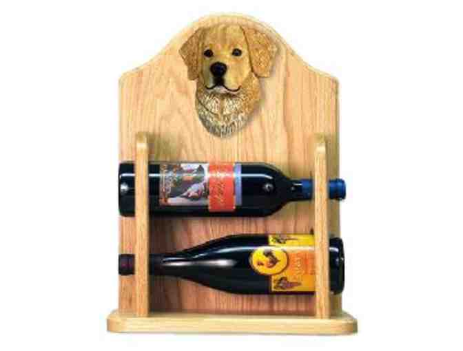 What goes good with a nice white wine? This designer wine rack features a Golden retriever head and is perfect for the holding your two favorite wines. The dog is a handpainted resin replica of an original woodcarving by Michael Park. Finished in light oak, this wine rack is designed to sit atop a flat surface.