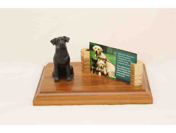 This business card holder will look wonderful on any dog lover's desk. The dog is a Black Labrador and is a handpainted resin replica of an original woodcarving by Michael Park. It is a solid walnut plaque with 22-karat gold-plated columns. The base is 5" x 7" long and is handpainted. This unique item is made in the USA.
