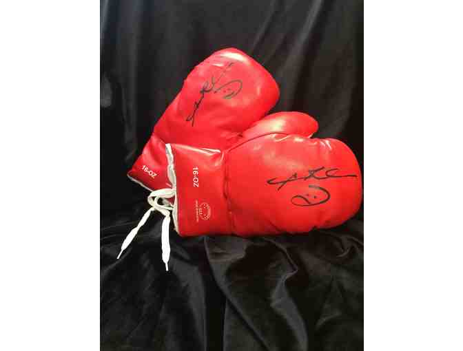 Two (2) boxing gloves (left and right) signed by Sugar Ray Leonard. Boxing gloves are red, 16 oz Defender gloves.