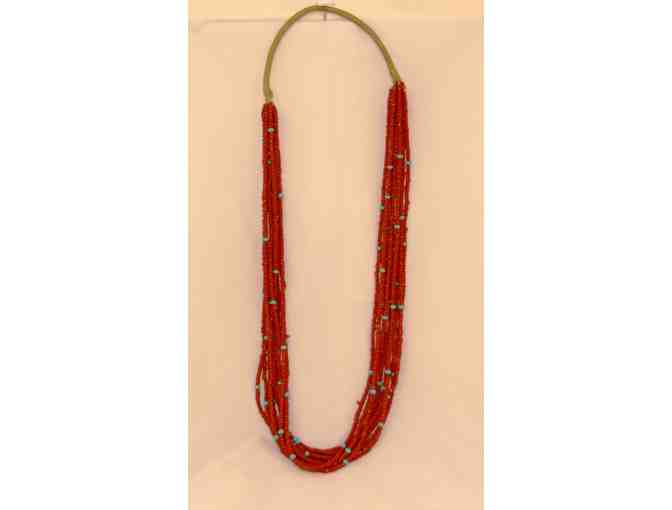 Native American Long Multi-strand Traditional Wrap Necklace. Coral beads with accents of blue turquoise. Measures 28" long.
