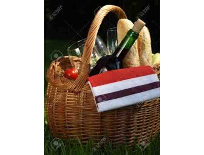 An assortment of products from France including a bottle of Bordeaux, Champagne, Mustard, Sea salt, basil olive oil, preserves and soaps. Cheese knives, dish cloth, napkins and a calendar are included.