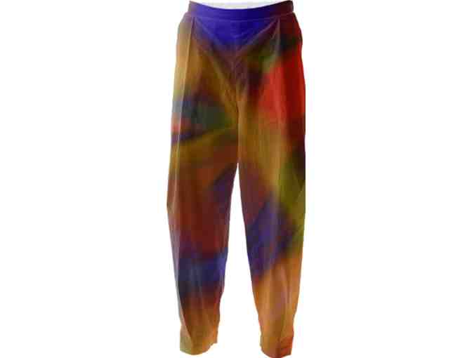 ORIGINAL ART WORK will cover the entire pant front / The backside will mirror the front / Covered elastic waistband in the back / Pant has deep pleats that create an architectural shape / The front has side seam slit pockets and the back features welt pockets / Body is 100% Cotton /