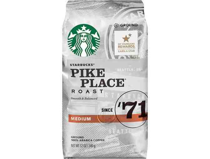 Take home 1 pound Starbucks Pike Place Roast, 1 pound decaf Pike Place Roast, 2 Mugs, and a Jar of delicious biscotti.
