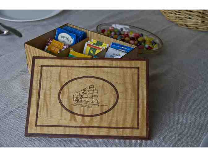 This beautiful wood tea box is made from curly maple, oak and birch. All pieces were laser cut and the box was assembled and finished by hand. The box measures 9-1/4 x 6-3/8 x 3-7/16 inches and contains 6 individual compartments. The box will include a selection of bagged tea. With the laser etched ship design on the lid, this box will make a nice addition to any tea lover's kitchen.