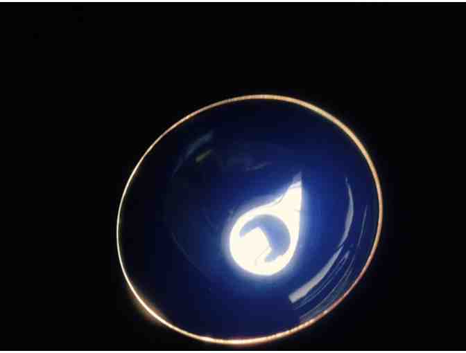 Gorgeous Enamel Bowl created and hand-crafted by James Levitz of the Kiln Design Studio of Williamsburg Brooklyn, NYC. The exterior is black and the interior is cobalt blue with a copper trim. (3” in diameter). Signed by artist.