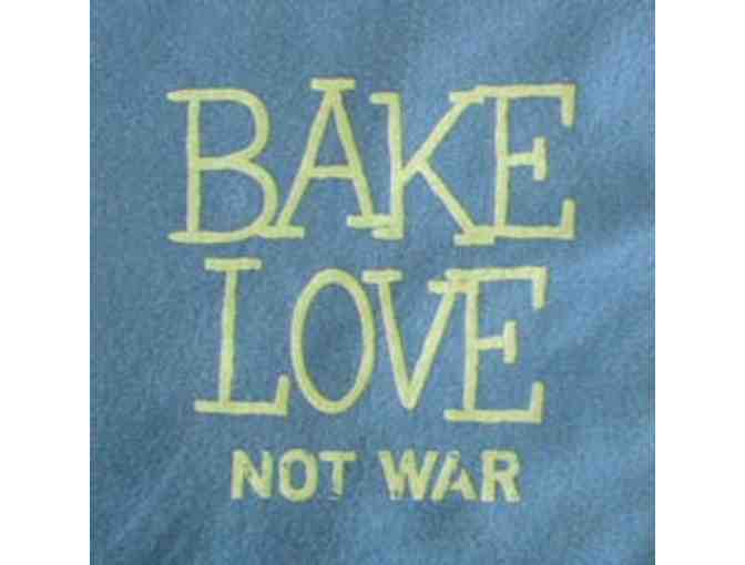 A long sleeve girl's t-shirt from Vermont Cookie Love, size Small. The shirt has their logo on the back and the words "Bake Love, Not War" on the front. Bright color, very soft, high quality cotton.