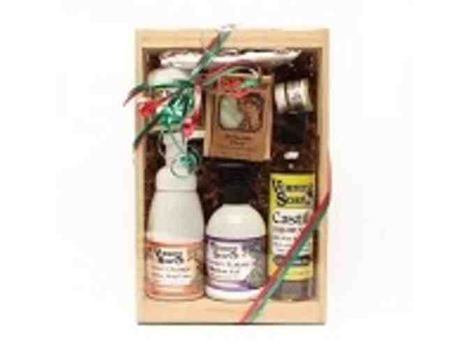 Includes (1ea): 3oz Balsam Pine Bar Soap, 8oz Sweet Orange Foaming Soap, 8oz Lavender Ecstasy Shower Gel, 8oz Lemongrass Castile Soap, 3.5oz Peppermint Magic Bath Salt, .7oz Arnica Salve, Loofa Scrub and a Hardwood Soap Dish! Also includes wrapped wooden gift crate.