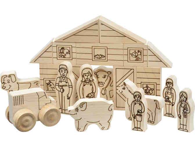 | Our 21 piece farm set includes our block barn, tractor and 9 play figures. |
