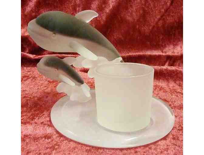 Beautiful glass mother & baby whales candle holder. New in the Box. 4.25 inches tall and 4.75 Wide at the base. Holds votive and tea light only.