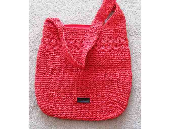 Summery woven shoulder bags by Esprit. 13" x 12 1/2", plus shoulder strap. Fully lined. Two inside pockets, zippered top. Deep orange-red and natural.