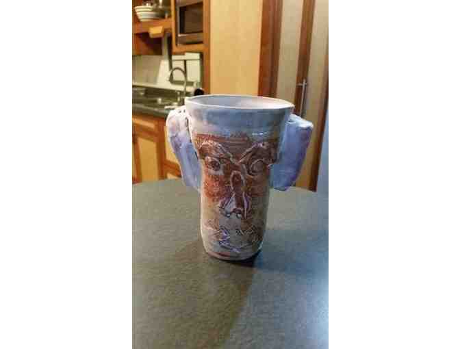 Humorous Vase with face sculpture on front. Shino glaze through out, will hold water, food safe, high fire stoneware