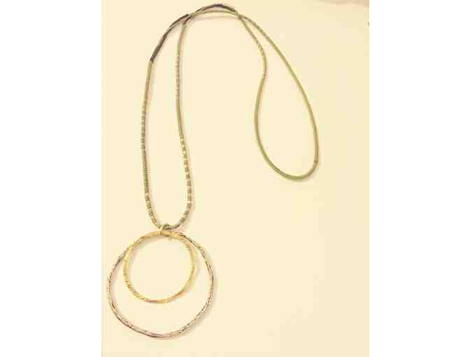 Necklace by local jewelry designer Wendy Stillman. Hand carved sterling silver large circle with hammered gold ring on long knotted cord.
