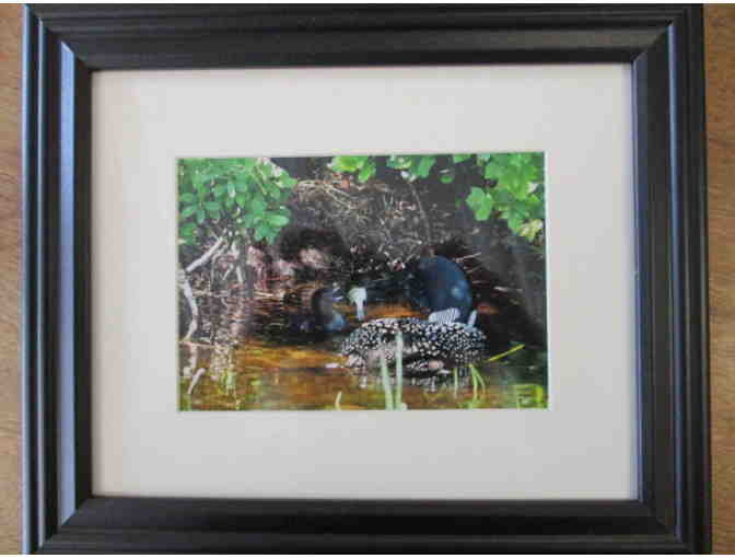 This lovely intimate photograph captures a father loon feeding his new chick. The mother loon, not pictured, is sitting on a nearby nest ready to hatch another chick. The photographer captured this intimate scene at Pawtuckaway Lake in NH. While taking this photo, the photographer was all too aware of the eagle circling overhead hoping for its next meal. The 5 x 7 photo is framed in a 10"x 12" black frame with 1 3/8" molding.