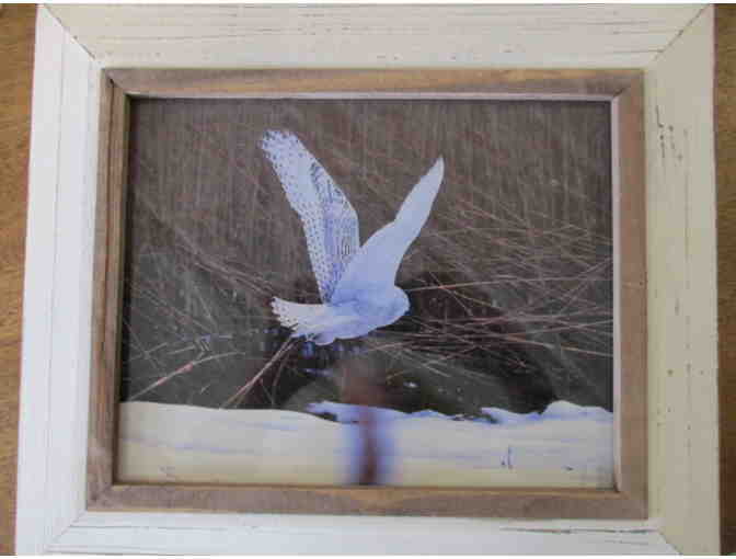 This magnificent 8 x 10 inch photo captures the beauty of this incredible bird. The photo was taken at Salisbury NH Beach State Park in January 2014. The photographer had just arrived as the owl took flight. The photographer grabbed her camera as the bird flew deep into the surrounding marsh. The rustic 11 3/4 x 13 3/4 inch frame echoes the colors of the marsh and this beautiful bird in flight.