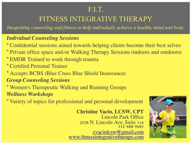 F.I.T. Fitness Integrative Therapy is a private counseling practice in Lincoln Park that integrates counseling and fitness to help clients achieve a healthy mind and body.