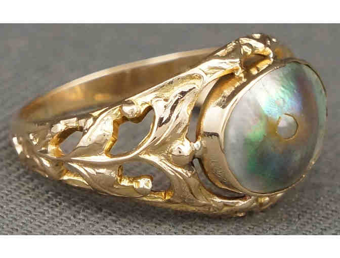 Elegant Solid 10K Yellow Gold and Abalone Pearl Floral Filigree Estate Ring