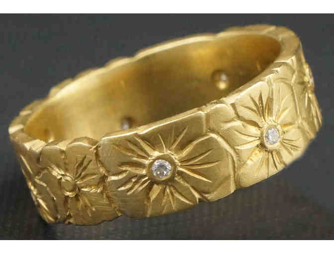 Solid 18K yellow gold and diamond floral motif wedding band. Extremely high quality and beautifully detailed ring. A perfect wedding or anniversary band. This is a solid 18K yellow gold ring engraved with flowers around the entire band, each with a bezel set diamond at the center. The ring has a satin finish with high polish accents to emphasize and define the engraved flowers. The diamonds have a combined weight of .10 cttw with a clarity grading of VS-1/2 and F-G color. The ring is a size 8 1/2, and could be sized down, but sizing up can be performed with different options to maintain the pattern or not depending on wearer’s preference. Additional costs may apply.