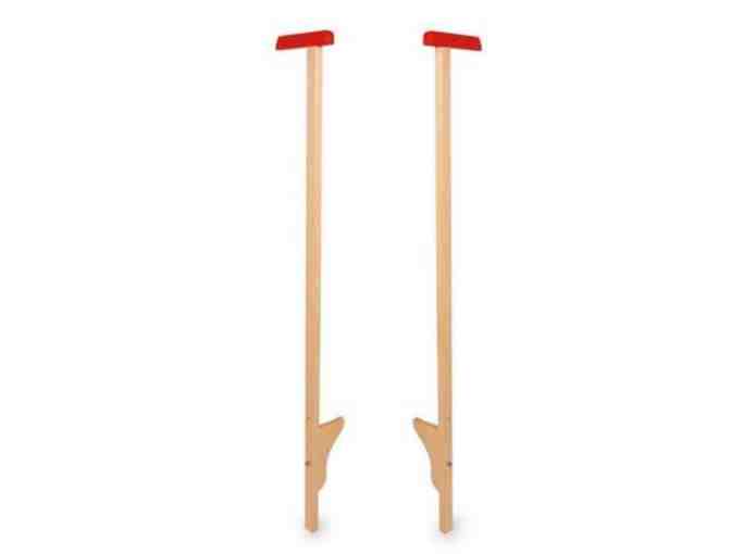 These wooden stilts for kids are imported from Europe. These lovely wooden toy stilts are made of untreated solid wood and have red lacquered wooden handles. The bases can also be adjusted at 2 different heights for even longer use. Walking on stilts can be tricky to master, and your child will fall off before they perfect this skill - but it is a wonderful coordination development activity, often introduced to Waldorf students in 4th grade and up. We recommend adult supervision as well as helmets and knee & elbow pads for new users. Get a set for some good old style fun!