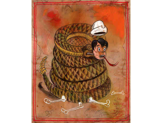This piece is original art produced and donated by artist Raul Gonzalez. It is done in the application of acrylic paint, colored pencil, pastel, and pen on coffee stained paper. Produced in 2012, this piece measures 9.5" x 11"