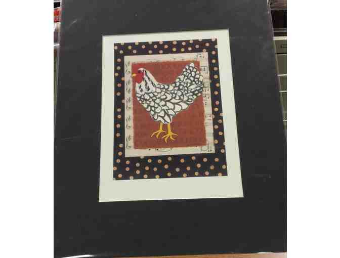 This portrait of a charming chicken is made from torn and cut paper glued to a watercolor background.
