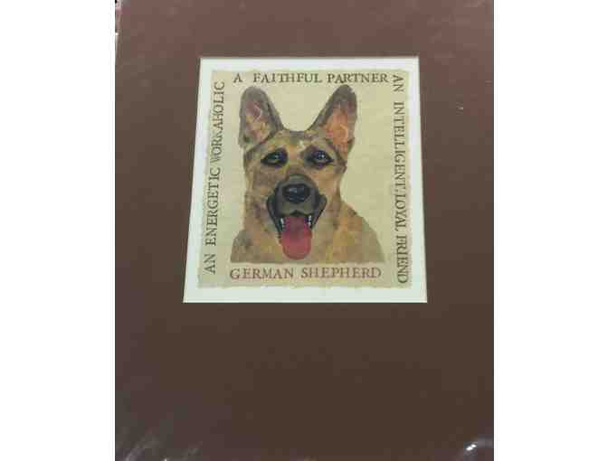 This portrait of the mighty German Shepherd is made from torn and cut paper glued to a watercolor background. The characteristics and breed name are rubber stamped one letter at a time. Own this work of art to honor your best friend!