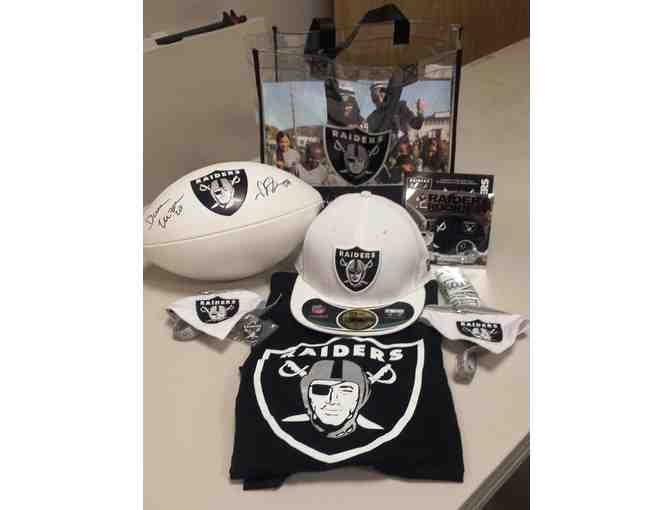 Raiders Fan Bag: Signed football, hat, tshirt, stickers, pin , (2) small dog collars, 2013 Community Programs full color book.